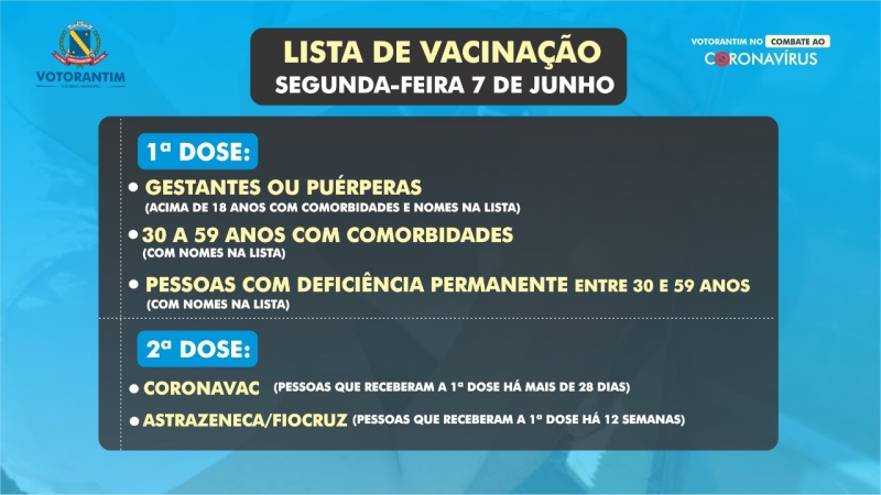 A primeira dose será fornecida a pessoas de 30 a 59 anos de idade com comorbidades. A Secretaria Municipal de Saúde solicita alguns documentos no momento do cadastro e da aplicação da vacina. Esse controle faz parte das orientações do Ministério da Saúde e também do acordo feito com o Ministério Público e a Prefeitura de Votorantim.