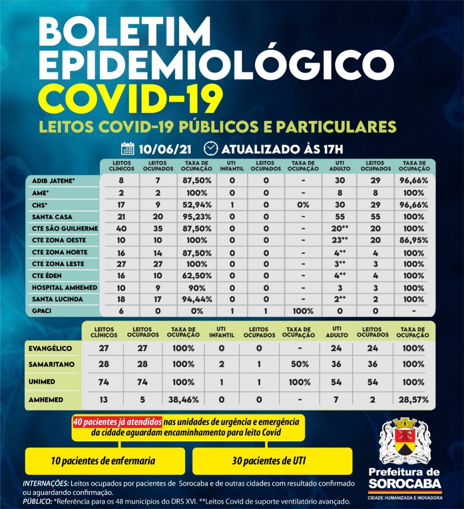 No censo diário de leitos da Covid-19 desta quinta-feira (10), no Hospital Estadual Adib Jatene, sete leitos clínicos Covid estão ocupados, sendo oito pactuados. Já os 30 leitos de UTI Covid (Unidade de Terapia Intensiva) encontram-se 96,66% ocupados. Outro hospital de esfera estadual, o Conjunto Hospitalar de Sorocaba (CHS), possui 17 leitos clínicos Covid e nove estão ocupados. O único leito de UTI infantil Covid encontra-se sem paciente. Dos 30 leitos de UTI Covid disponibilizados neste hospital, 29 estão ocupados. O AME possui dois leitos clínicos covid e dois estão ocupados. Dos oito leitos de UTI Covid deste local, oito possuem pacientes.