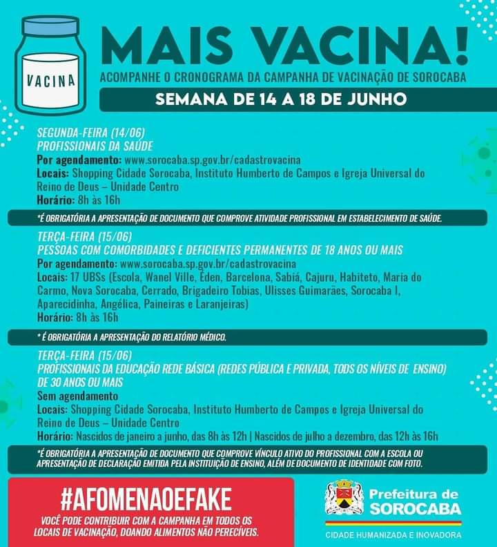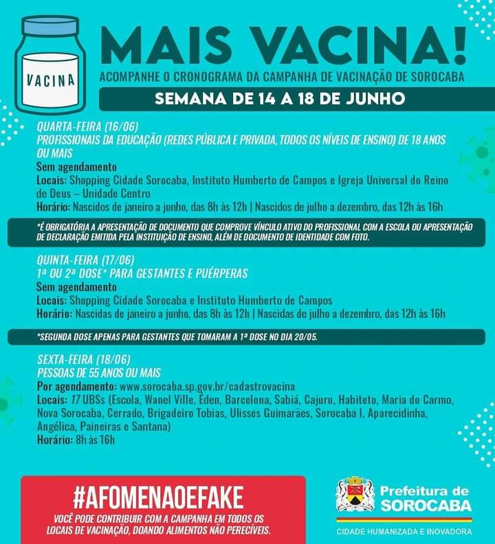 Por fim, na sexta-feira (18), terá início a vacinação da faixa etária de 55 a 59 anos sem comorbidades. Para esse grupo é necessário agendamento através do site www.sorocaba.sp.gov.br/cadastrovacina