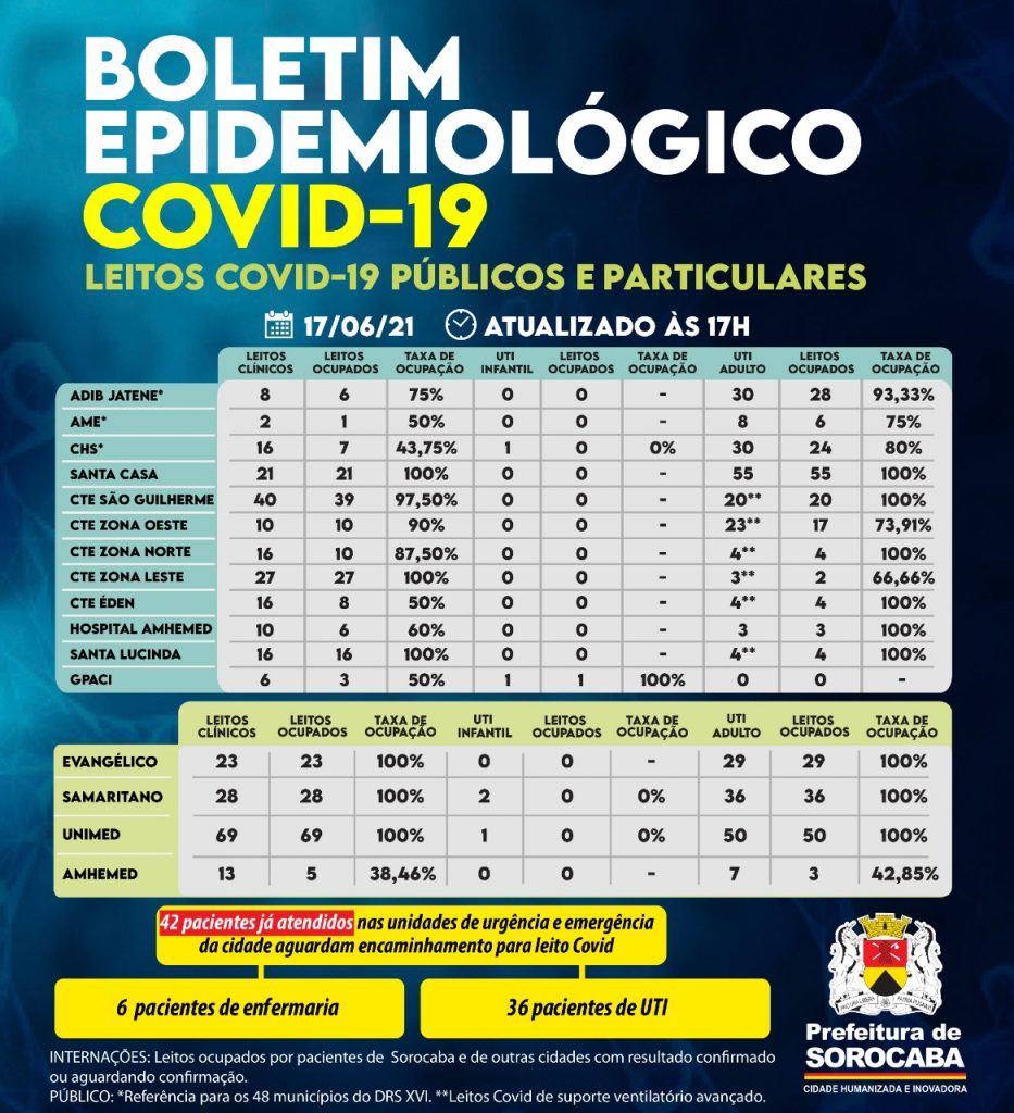 Dos hospitais contratualizados pela Prefeitura de Sorocaba para oferecer leitos Covid, a Santa Casa está com 100% de ocupação nos leitos clínicos Covid. Ou seja, dos 21 existentes, 21 possuem pacientes. A ocupação de UTI Covid da Santa Casa é de 100%, o que representa 55 leitos ocupados dos 55 contratados. O Hospital Santa Lucinda possui um total de 16 leitos clínicos Covid e 16 estão ocupados. O mesmo hospital também possui quatro leitos de UTI Covid e quatro estão ocupados. Dos seis leitos clínicos Covid do GPACI, três estão ocupados. O Gpaci também possui um leito de UTI infantil que encontra-se ocupado. O Hospital Amhemed possui 10 leitos clínicos Covid e seis estão ocupados. Já, dos três leitos de UTI Covid deste mesmo hospital, três encontram-se ocupados.
