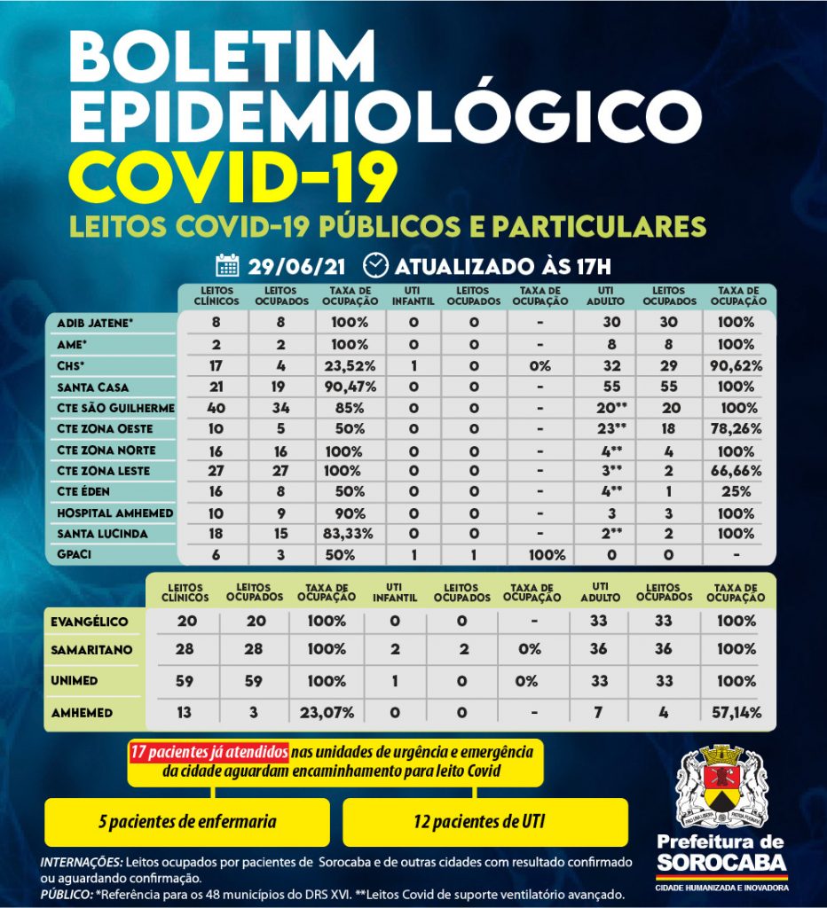 No censo diário de leitos da Covid-19 desta terça-feira (29), no Hospital Estadual Adib Jatene, oito leitos clínicos Covid estão ocupados, sendo oito pactuados. Já os 30 leitos de UTI Covid (Unidade de Terapia Intensiva) encontram-se 100% ocupados. Outro hospital de esfera estadual, o Conjunto Hospitalar de Sorocaba (CHS), possui 17 leitos clínicos Covid e quatro estão ocupados. O único leito de UTI infantil Covid encontra-se sem paciente. Dos 32 leitos de UTI Covid disponibilizados neste hospital, 29 estão ocupados. O AME possui dois leitos clínicos covid e dois encontram-se ocupados. Dos oito leitos de UTI Covid deste local, oito possuem pacientes.