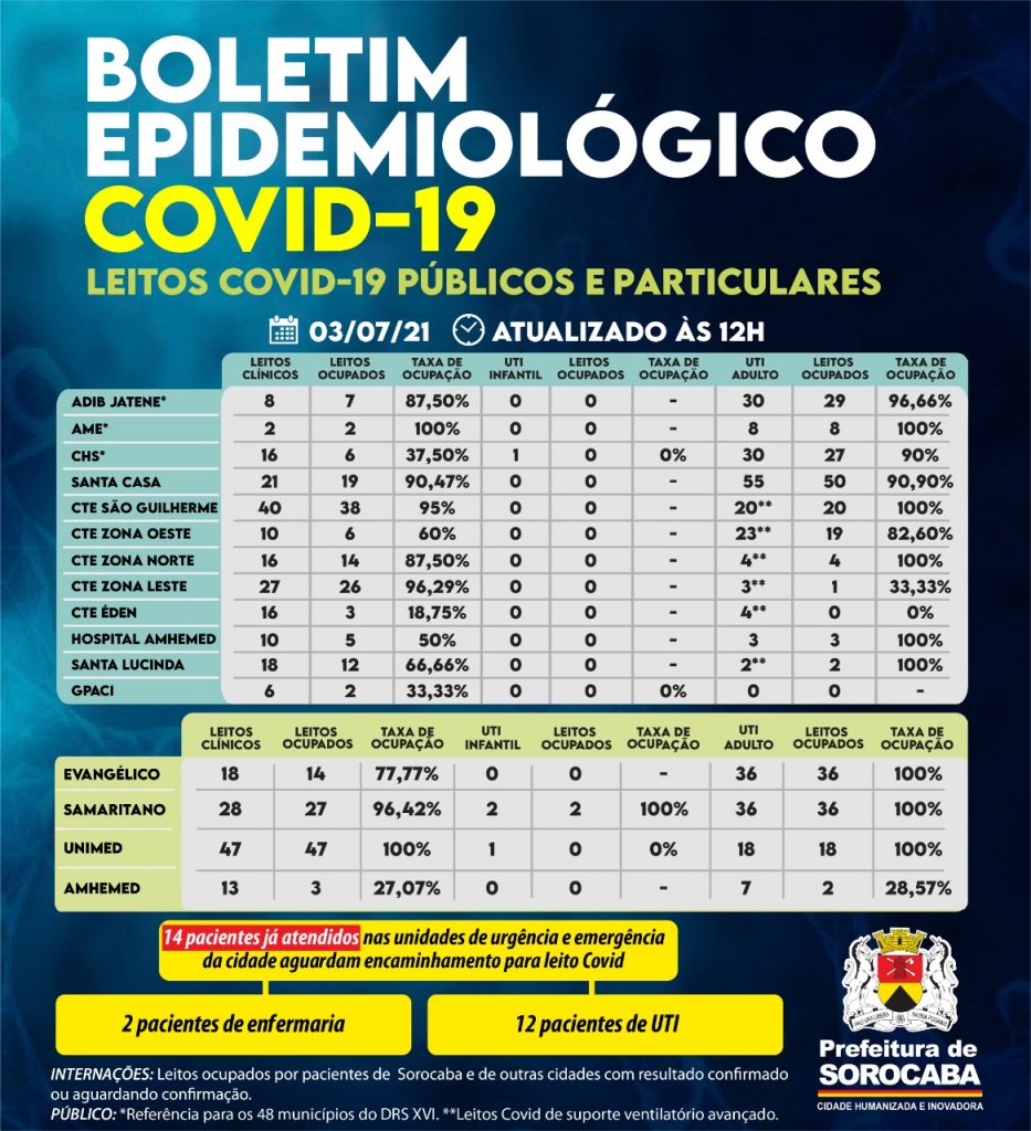 No censo diário de leitos da Covid-19 deste sábado (3), no Hospital Estadual Adib Jatene, sete leitos clínicos Covid estão ocupados, sendo oito pactuados. Já os 30 leitos de UTI Covid (Unidade de Terapia Intensiva) encontram-se 96,66% ocupados. Outro hospital de esfera estadual, o Conjunto Hospitalar de Sorocaba (CHS), possui 16 leitos clínicos Covid e seis estão ocupados. O único leito de UTI infantil Covid encontra-se sem paciente. Dos 30 leitos de UTI Covid disponibilizados neste hospital, 27 estão ocupados. O AME possui dois leitos clínicos covid e todos encontram-se ocupados. Dos oito leitos de UTI Covid deste local, oito possuem pacientes.