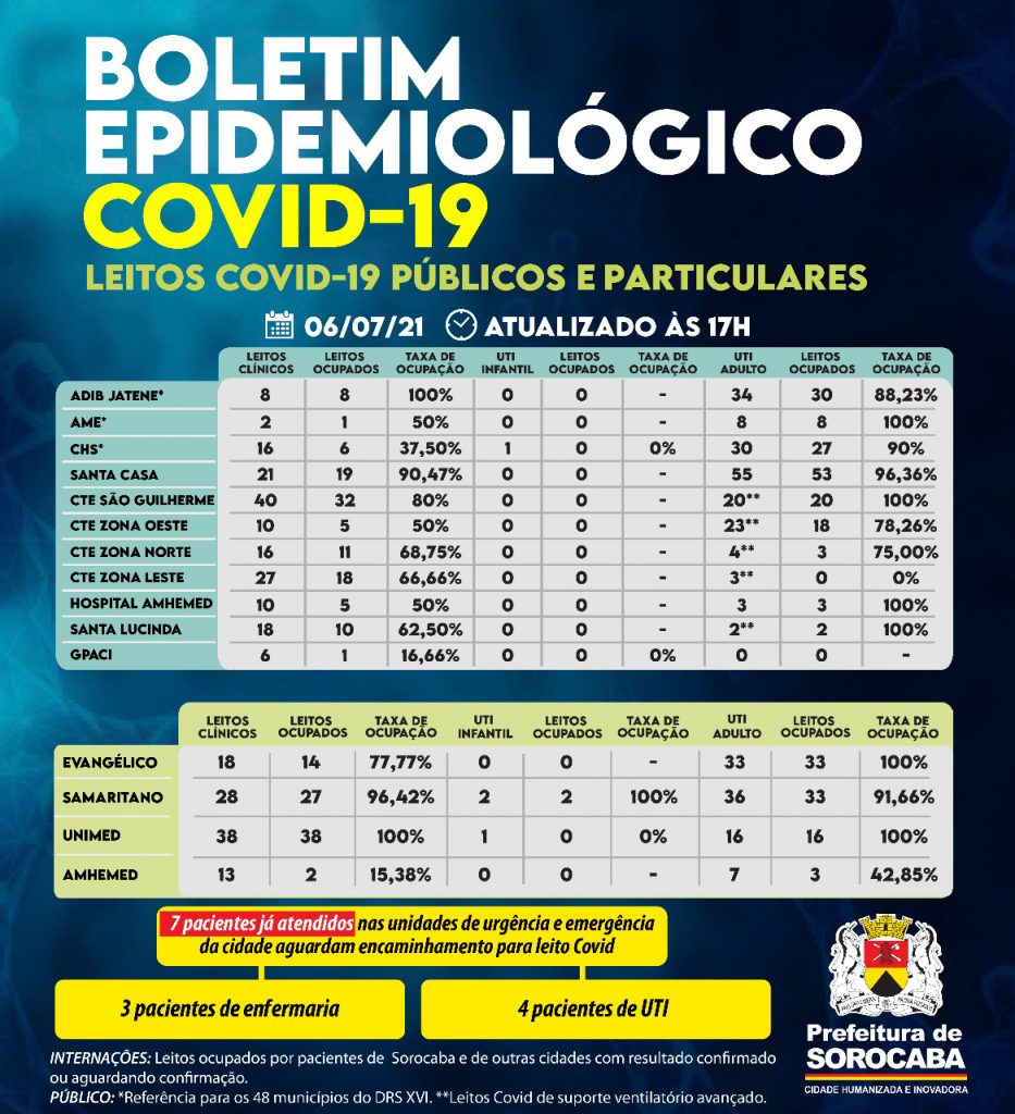 No censo diário de leitos da Covid-19 desta terça-feira (6), no Hospital Estadual Adib Jatene, oito leitos clínicos Covid estão ocupados, sendo oito pactuados. Já os 34 leitos de UTI Covid (Unidade de Terapia Intensiva) encontram-se 88,23% ocupados. Outro hospital de esfera estadual, o Conjunto Hospitalar de Sorocaba (CHS), possui 16 leitos clínicos Covid e seis estão ocupados. O único leito de UTI infantil Covid encontra-se sem paciente. Dos 30 leitos de UTI Covid disponibilizados neste hospital, 27 estão ocupados. O AME possui dois leitos clínicos covid e um encontra-se ocupado. Dos oito leitos de UTI Covid deste local, oito possuem pacientes.
