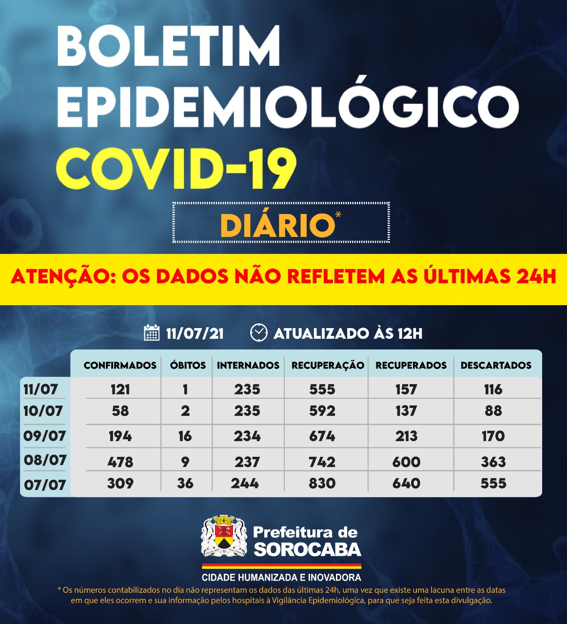 Sorocaba recebeu a notificação de mais 121 casos confirmados da Covid-19, 157 recuperados e um óbito, este ocorrido no sábado (10), mas informado pelo hospital à Vigilância Epidemiológica e computado no dia de hoje (11). Do total de confirmados, 235 estão internados (139 em UTI) e o total de pessoas em recuperação (isolamento domiciliar) é 555.