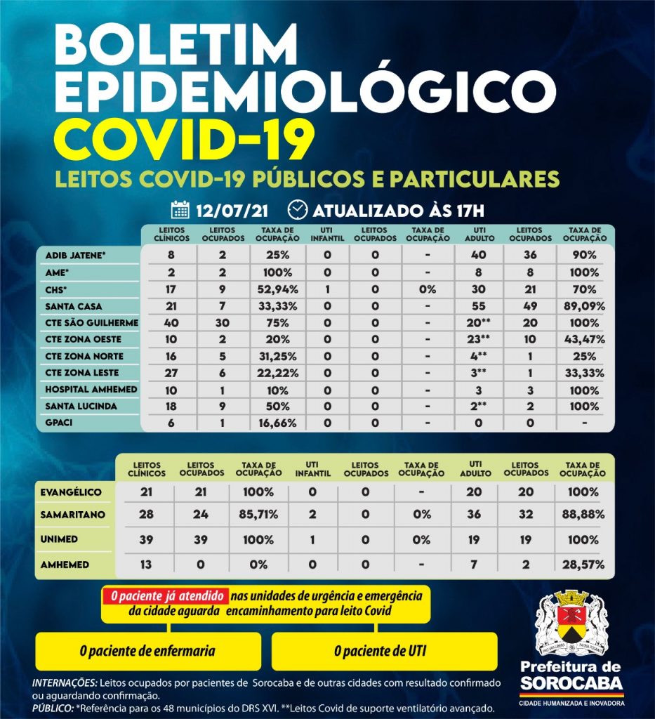 Pelo terceiro dia seguido, a cidade não tem fila de espera por leitos e em alguns hospitais, como a Santa Casa, Samaritano e Conjunto Hospitalar de Sorocaba (CHS), as UTIs têm ocupação inferior a 90%. A última vez que Sorocaba teve a fila zerada foi no dia 29 de maio.