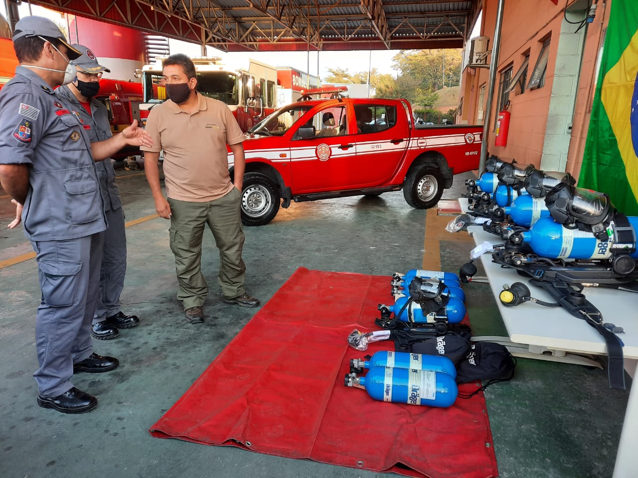 Com a presença do Coronel PM Victor, comandante do CBI-1, e o Major PM Godinho, comandante do 15° GB e integrantes da corporação, o deputado conferiu os cinco EPRs (Equipamento Autônomo de Proteção Respiratória) que serão de extrema valia para a corporação no combate a incêndios.