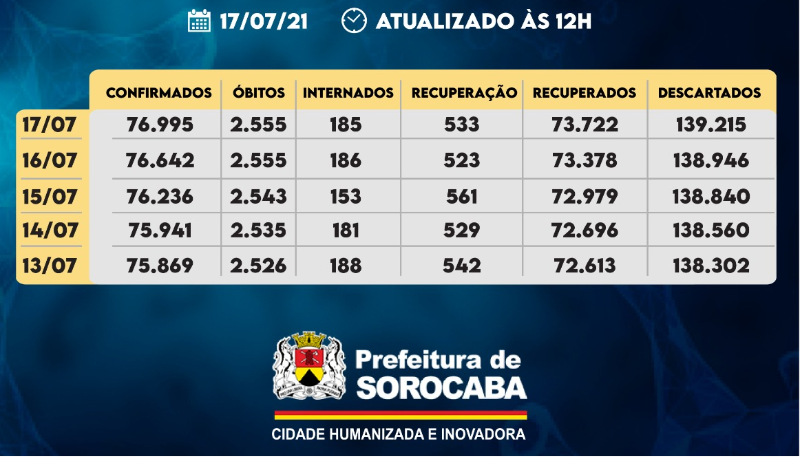 A Prefeitura de Sorocaba, por meio da Secretaria da Saúde, registrou aumento do número de recuperados da Covid-19 neste sábado (17), chegando ao total de 73.722, com mais 344 pacientes recuperados da doença.