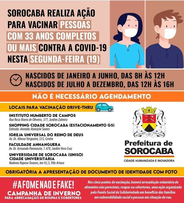 Os imunizantes serão distribuídos no Instituto Humberto de Campos, na rua Rosa Maria de Oliveira, 377, no Jardim Zulmira; na Faculdade Anhanguera, na avenida Doutor Armando Pannunzio, 1.478, Jardim Vera Cruz; no Shopping Cidade Sorocaba, no estacionamento G5, com entrada pela avenida Atanázio Soares; na Igreja Universal do Reino de Deus, na avenida Dr. Afonso Vergueiro, ao lado do Terminal Santo Antônio; e na Universidade de Sorocaba (Uniso), na Rodovia Raposo Tavares, km 92,5.