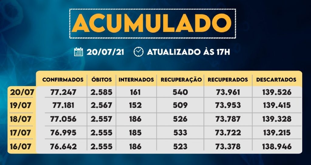 A cidade apresentou queda do número de pessoas com suspeita de contaminação pelo coronavírus e que aguardam resultados de 781 para 566. Entre os suspeitos, 62 estão internados em hospitais da cidade, sendo 19 em UTI. Há dois óbitos em investigação. O número de descartados por resultados negativos da doença aumentou para 139.526.