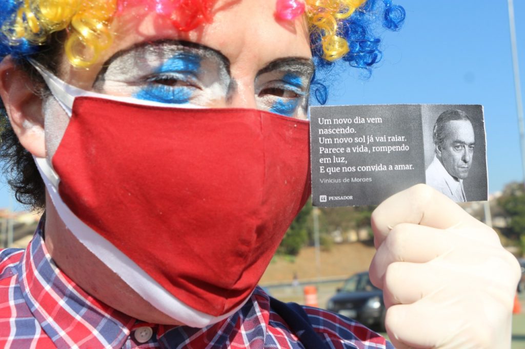 Um palhaço, interpretado pelo ator Guilherme Augusto de Toledo Costa, 37 anos, interagiu com o público na fila e presenteou os moradores com os versos, na praça Lecy de Campos.