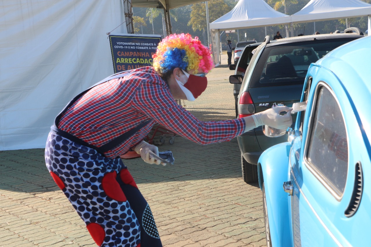 Um palhaço, interpretado pelo ator Guilherme Augusto de Toledo Costa, 37 anos, interagiu com o público na fila e presenteou os moradores com os versos, na praça Lecy de Campos.