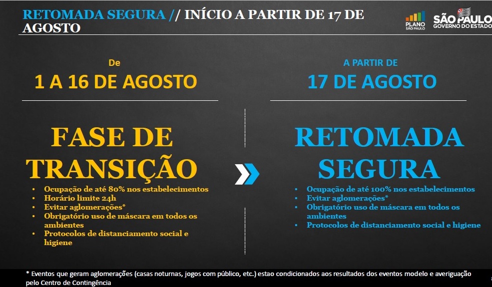 As novas regras da fase de transição vão valer entre os dias 1 e 16 de agosto. O limite de horário de funcionamento de comércios, serviços em geral e espaços religiosos passa de 23h para 0h. O governador João Doria também confirmou o fim do toque de recolher durante as madrugadas.