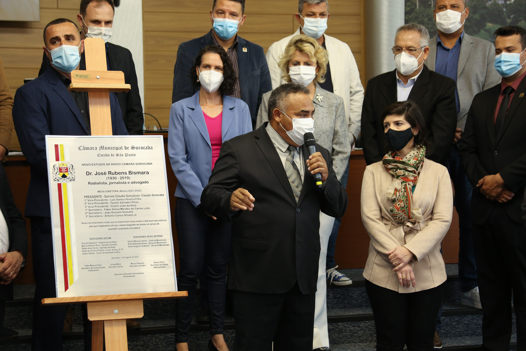 O novo estúdio da Rádio Câmara, que irá oferecer um espaço mais amplo para entrevistados, apresentadores e equipe técnica, melhorando a qualidade de suas transmissões, foi inaugurado pelo presidente da Câmara Municipal, vereador Cláudio Sorocaba (PL), na manhã desta quinta-feira (12), antes da ordem do dia da sessão ordinária.
