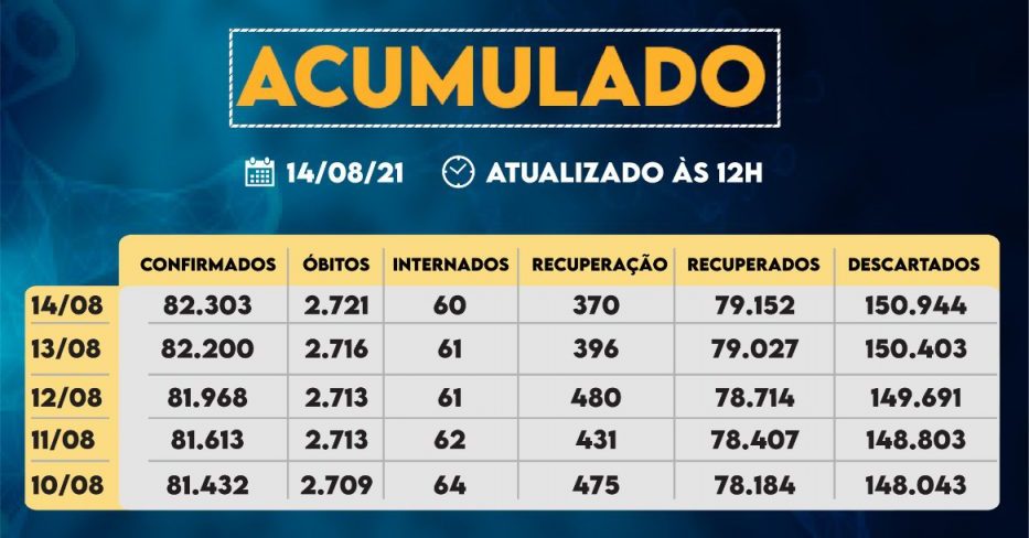 Sorocaba recebeu a notificação de mais 103 casos confirmados da Covid-19, 125 recuperados e cinco óbitos, estes ocorridos desde o dia 9 de agosto, mas informados pelos hospitais à Vigilância Epidemiológica e computados apenas no dia de hoje (14). Do total de confirmados, 60 estão internados (30 em UTI) e o total de pessoas em recuperação (isolamento domiciliar) é 370.