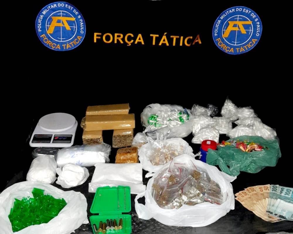 Dentro do carro, os PMs encontraram 1.196 micro tubos contendo cocaína, 167 pedras de crack, 104 porções de maconha e 07 munições calibre 38 integras.