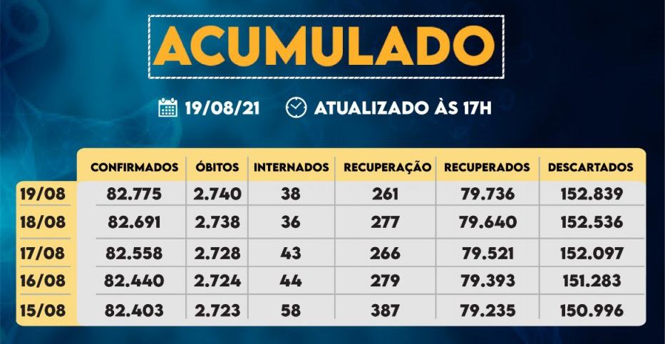 Sorocaba recebeu a notificação de mais 84 casos confirmados da Covid-19, 96 recuperados e dois óbitos, estes ocorridos desde o dia 13 de agosto, mas informados pelos hospitais à Vigilância Epidemiológica e computados apenas no dia de hoje (19 de agosto). Do total de confirmados, 38 estão internados (24 em UTI) e o total de pessoas em recuperação (isolamento domiciliar) é 261.