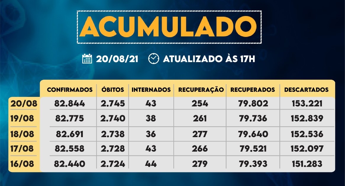 Sorocaba recebeu a notificação de mais 69 casos confirmados da Covid-19, 66 recuperados e cinco óbitos, estes ocorridos desde o dia 16 de agosto, mas informados pelos hospitais à Vigilância Epidemiológica e computados apenas no dia de hoje (20 de agosto). Do total de confirmados, 43 estão internados (27 em UTI) e o total de pessoas em recuperação (isolamento domiciliar) é 254.