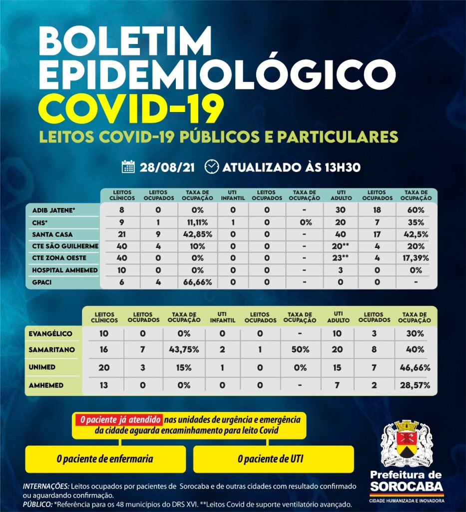 Outro hospital de esfera estadual, o Conjunto Hospitalar de Sorocaba (CHS), possui nove leitos clínicos Covid e um está ocupado. O único leito de UTI infantil Covid encontra-se sem paciente. Dos 20 leitos de UTI Covid disponibilizados neste hospital, sete estão ocupados.