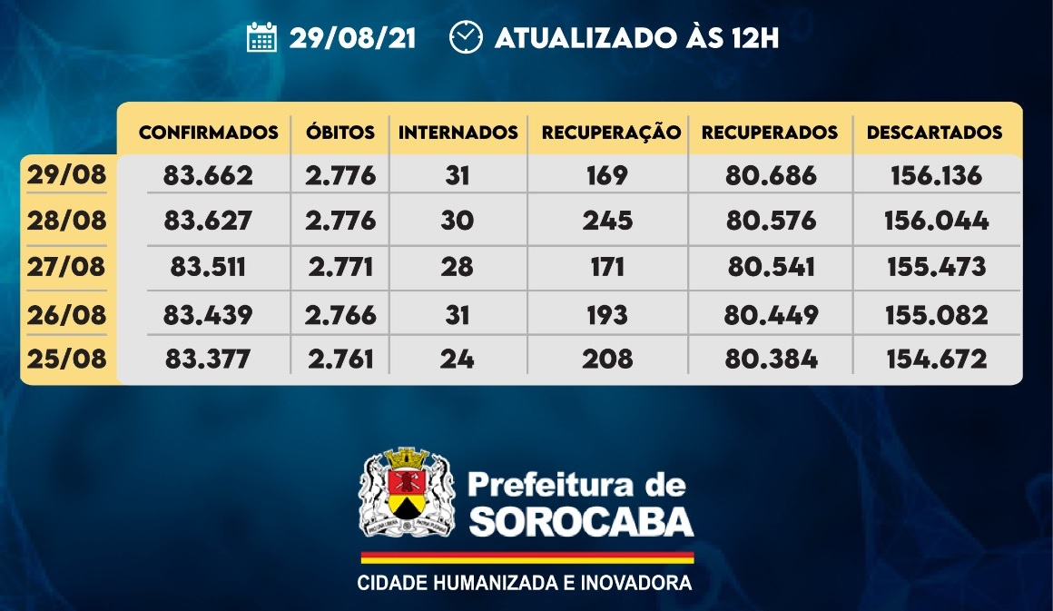 A Prefeitura de Sorocaba, por meio da Secretaria da Saúde (SES), recebeu neste domingo (29), a notificação de mais 35 casos confirmados da Covid-19, 110 recuperados e nenhum óbito. Do total de confirmados, 31 estão internados (21 em UTI) e o total de pessoas em recuperação (isolamento domiciliar) é 169.