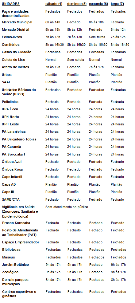 Já os serviços prestados pelos setores essenciais, como atendimentos a urgências e emergências, seguem normalmente, sem alteração durante o feriado prolongado.