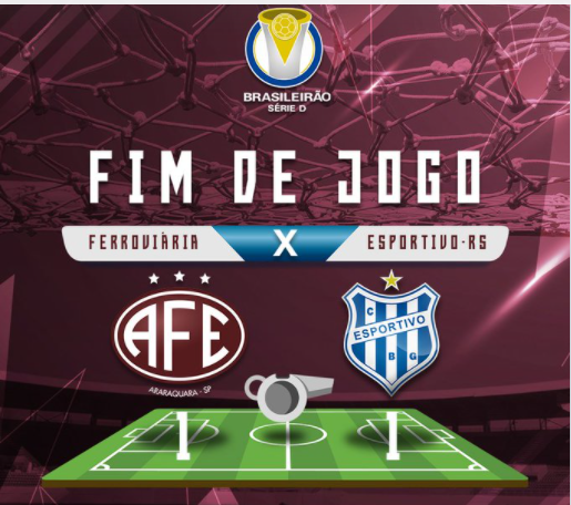 A Ferroviária-SP garantiu presença nas quartas de final da Série D do Campeonato Brasileiro após empate em 1 a 1 com o Esportivo-RS, na Arena Fonte Luminosa, em Araraquara (SP). A Locomotiva, que já havia vencido por 2 a 1 fora de casa o jogo de ida das oitavas, saiu na frente aos 27 minutos, com gol do atacante Júlio Vitor. O Zebrão chegou a igualar o placar aos 46 minutos da etapa final, com Peixoto.Confira detalhe do jogo na reportagem de Nilson Duarte. Com informações da Agência Brasil.