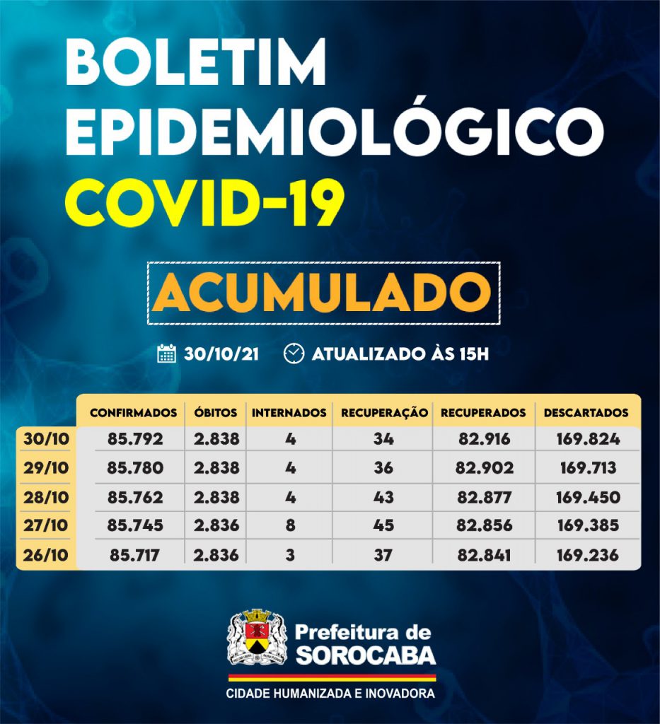 A Prefeitura de Sorocaba, por meio da Secretaria da Saúde (SES), registrou aumento do número de recuperados da Covid-19 neste sábado (30), chegando ao total de 82.916. Já, os casos confirmados com a doença passaram de 85.780 para 85.792 na cidade. Os óbitos confirmados continuam em 2.838. A taxa de letalidade no município é de 3,3%, abaixo da taxa estadual, que é de 3,4%, e acima da taxa nacional, que se encontra em 2,8%.