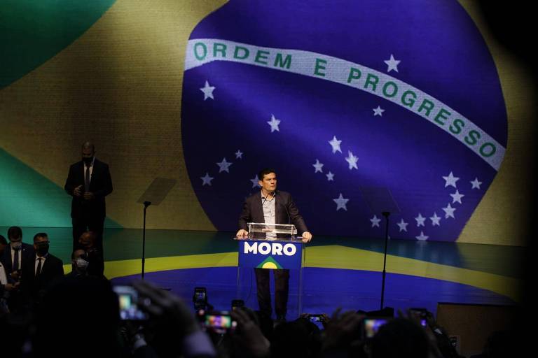 O ex-ministro da Justiça e ex-juiz Sergio Moro se filiou ao partido Podemos, nesta quarta-feira (10), durante evento realizado no Centro de Convenções Ulysses Guimarães, em Brasília.