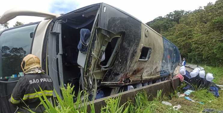 O acidente ocorreu na altura do km 75 da rodovia, quando o ônibus tombou no trecho da serra – dez viaturas dos bombeiros e um helicóptero da Polícia Militar prestam apoio.