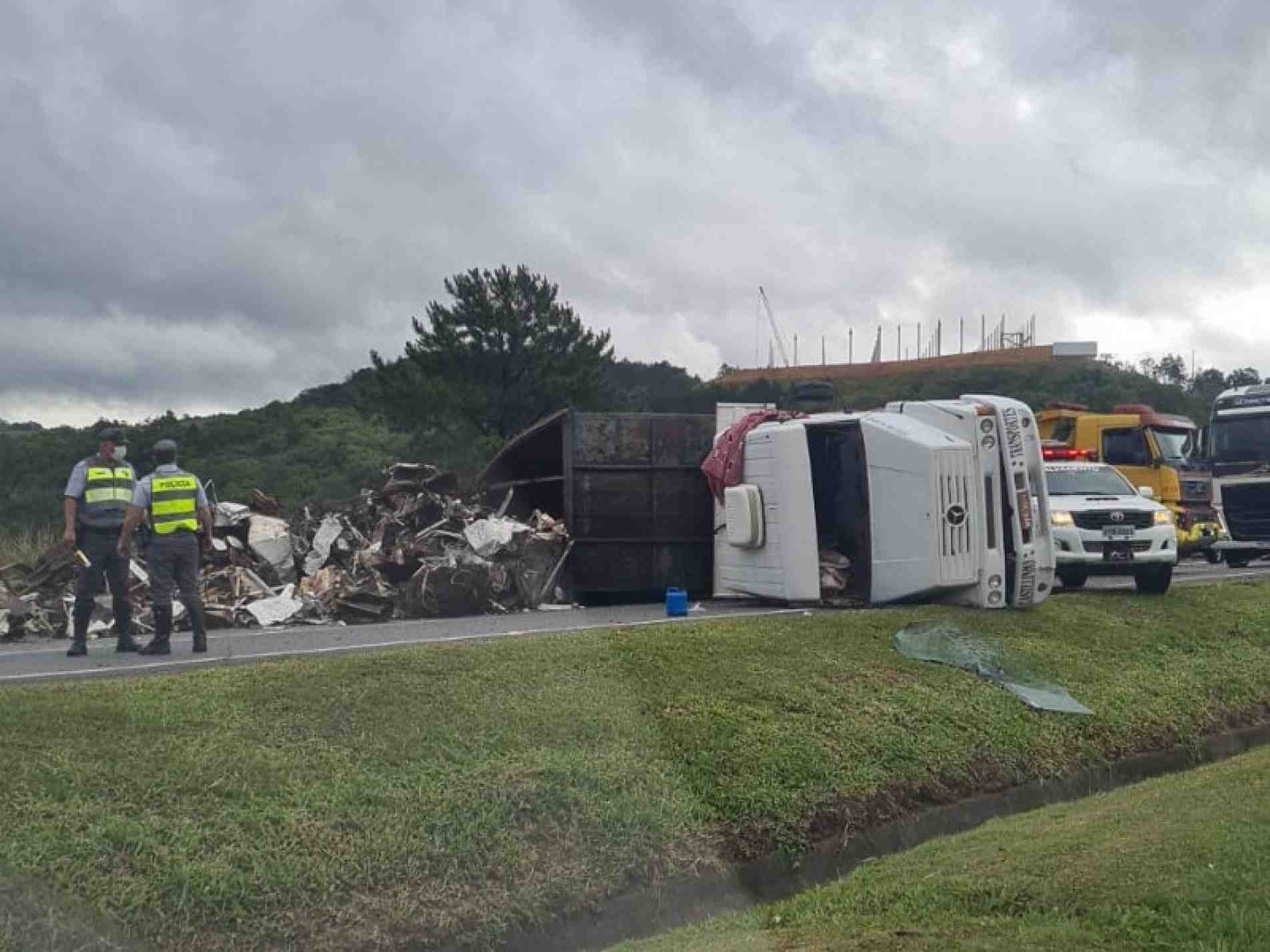 Um caminhão carregado com sucata tombou, na tarde desta sexta-feira (26), na altura do quilômetro 56 da rodovia Castello Branco, em Araçariguama.