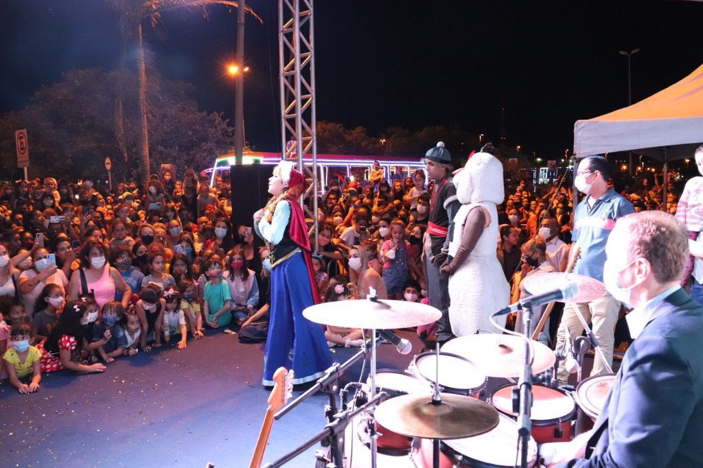 Uma das atrações na abertura da programação “Sorocaba Iluminada – Natal 2021”, no Paço Municipal, nesta quarta-feira (1), foi “Frozen” – Uma Aventura de Natal congelante, um espetáculo gratuito, com personagens caracterizados do filme, repleto de magia, que levou o encanto natalino especialmente às crianças. Os sorocabanos que prestigiaram a abertura das festividades também puderam conferir o show da banda BR Code.