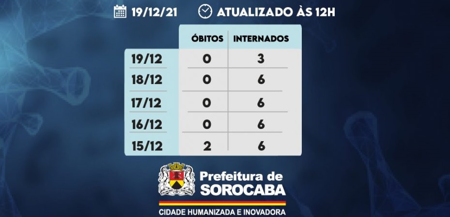Sorocaba não teve notificação de novos óbitos confirmados da Covid-19 neste domingo (19). Do total de confirmados com a doença, três estão internados e em UTI. Entre os suspeitos, 11 estão internados em hospitais da cidade, sendo dois em UTI.