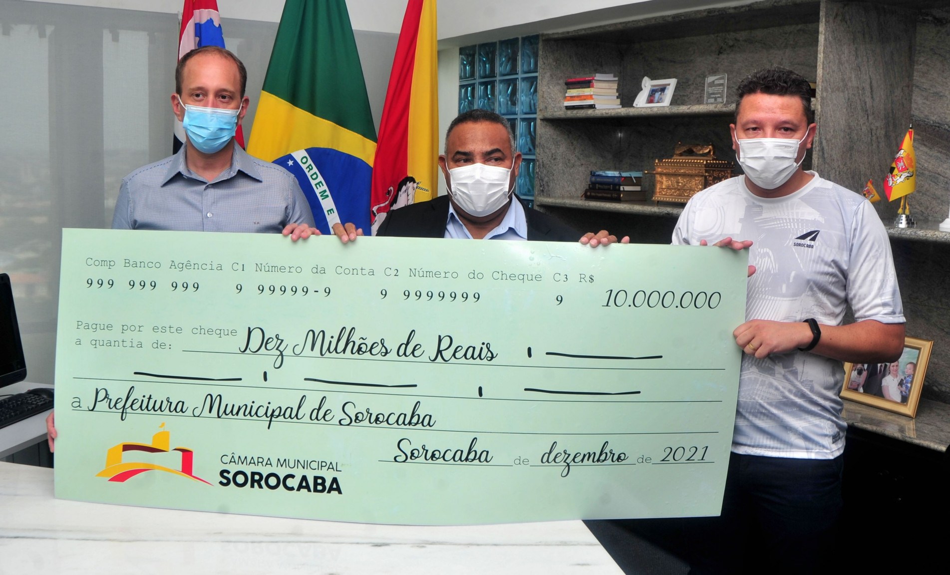 O presidente da Câmara Municipal, Cláudio Sorocaba (PL), acompanhado pelo vereador Cristiano Passos (Republicanos), entregou ao prefeito Rodrigo Manga, nesta quarta-feira (22), o cheque simbólico que representa a economia de R$ 11,5 milhões feita pelo Poder Legislativo em 2021.