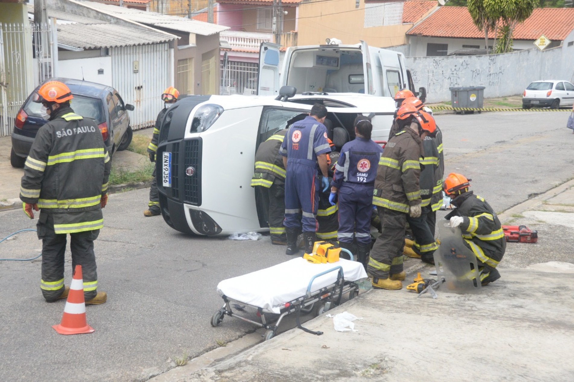 Um veículo capotou na manhã desta quarta-feira (12), na rua Otávio Luvizoto, altura do número 32, no jardim Altos do Itavuvu, na zona norte de Sorocaba.