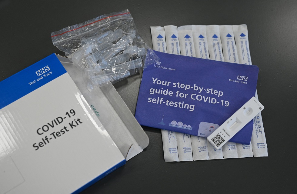 An NHS branded box containing seven lateral flow Covid-19 tests, which will be given to students to take home an administer themselves twice weekly, is pictured at Park Lane Academy in Halifax, northwest England on March 8, 2021 as schools reopen following the easing of lockdown restrictions. England prepares to reopen schools to in-class teaching on Monday in the first phase of ending its third coronavirus lockdown. / AFP / Oli SCARFF