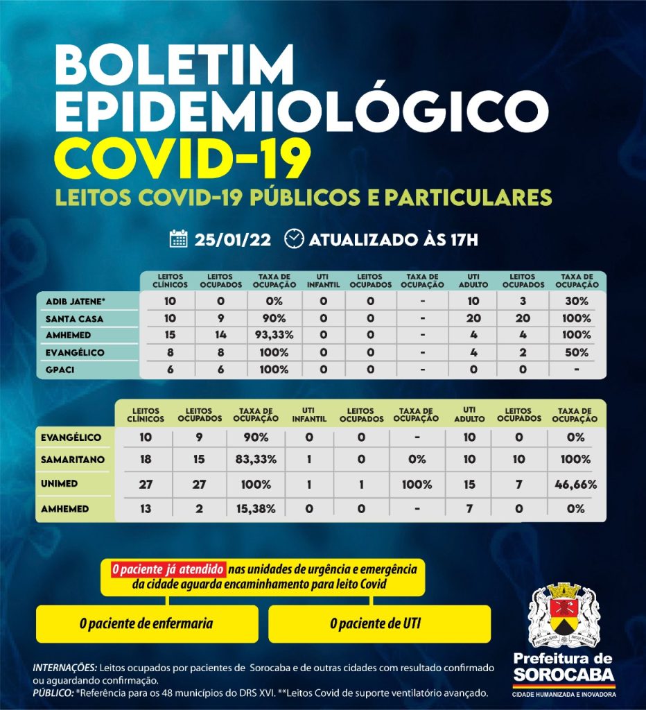 Sorocaba recebeu a notificação de mais 968 casos confirmados da Covid-19, 808 recuperados e 11 óbitos, estes ocorridos desde o dia 11 de janeiro de 2022, mas informados pelo hospitais à Vigilância Epidemiológica e computados no dia de hoje (25).