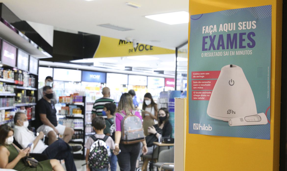 Movimento de pessoas em farmácia para a realização de exames rápidos de Covid e Influenza.