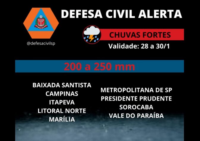 A Defesa Civil Estadual emitiu um alerta, para várias regiões do Estado de São Paulo, sobre a ocorrência de chuvas fortes entre esta sexta-feira (28) até o próximo domingo (30).
