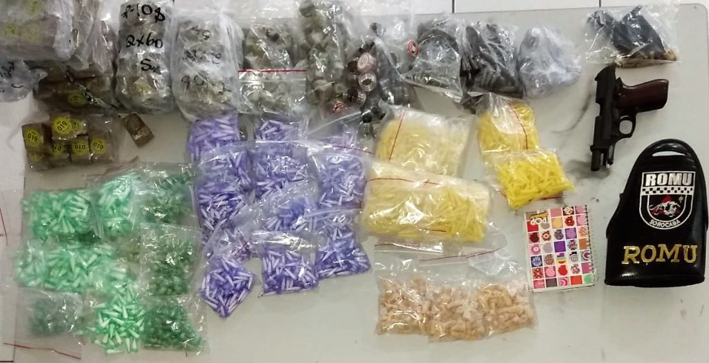 Chegando ao estabelecimento, os guardas abordaram o proprietário, de 28 anos, que, ao notar a viatura, dispensou uma mochila. Dentro dela, havia parte dos entorpecentes. Em busca pelo local, foi localizada outra bolsa, também contendo grande quantidade de drogas, além de uma arma de fogo, modelo PT Taurus 7,65, e anotações do tráfico.