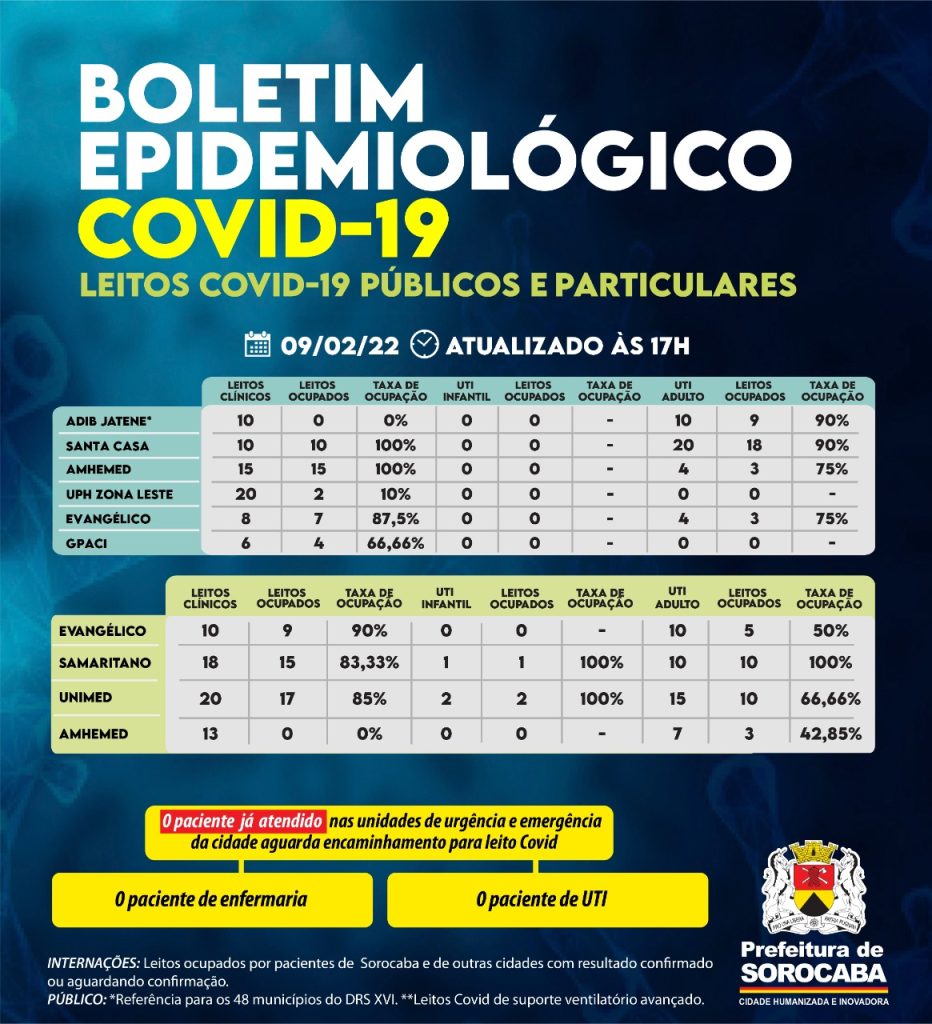 Dos hospitais contratualizados pela Prefeitura de Sorocaba para oferecer leitos Covid, a Santa Casa está com 100% de ocupação nos leitos clínicos Covid. Ou seja, dos 10 existentes, 10 possuem pacientes. A ocupação de UTI Covid da Santa Casa é de 90%, o que representa 18 leitos ocupados dos 20 contratados. Dos seis leitos clínicos Covid do GPACI, quatro estão ocupados.
