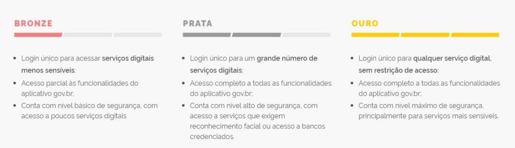 A conta gov.br tem três níveis de segurança e acesso: bronze, prata e ouro.