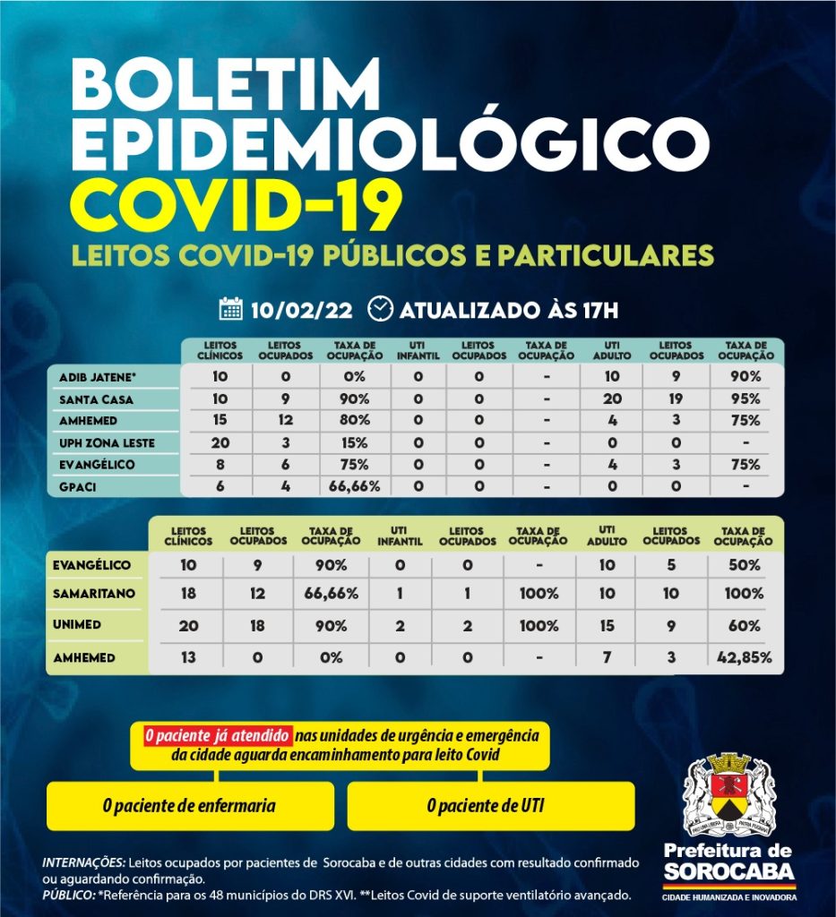 Sorocaba recebeu a notificação de mais 206 casos confirmados da Covid-19, 672 recuperados e seis óbitos, estes ocorridos desde o dia 30 de janeiro de 2022, mas informados pelos hospitais à Vigilância Epidemiológica e computados apenas no dia de hoje (10). Do total de confirmados, 81 estão internados (37 em UTI) e o total de pessoas em recuperação (isolamento domiciliar) é 826.