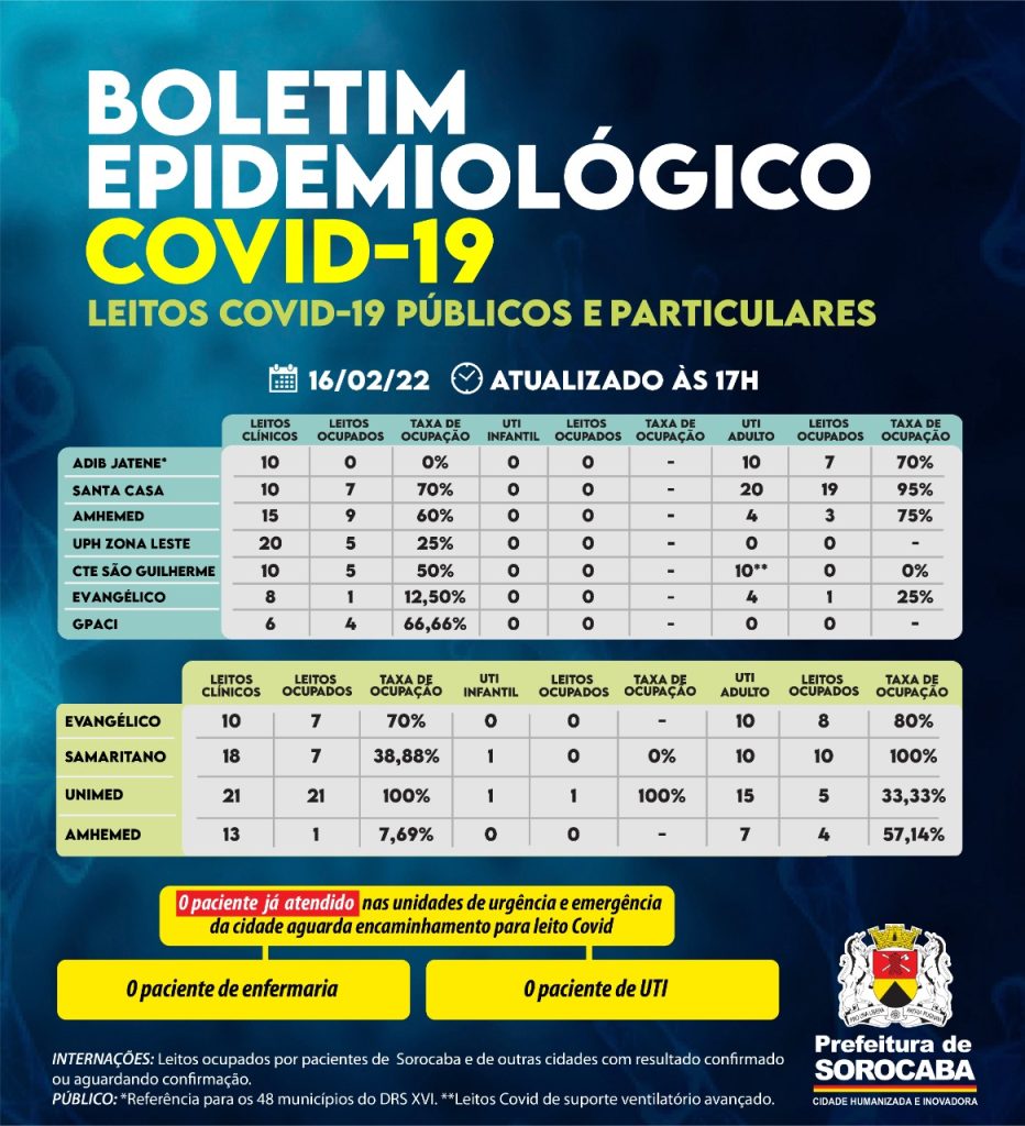 Sorocaba recebeu a notificação de mais 549 casos confirmados da Covid-19, 532 recuperados e três óbitos, estes ocorridos desde o dia 11 de fevereiro de 2022, mas informados pelos hospitais à Vigilância Epidemiológica e computados apenas no dia de hoje (16). Do total de confirmados, 78 estão internados (32 em UTI) e o total de pessoas em recuperação (isolamento domiciliar) é 699.