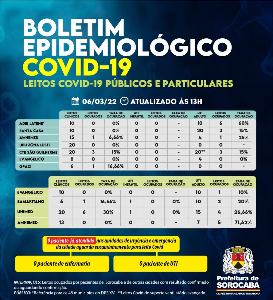 Dos hospitais contratualizados pela Prefeitura de Sorocaba para oferecer leitos Covid, a Santa Casa está com 0% de ocupação nos leitos clínicos Covid. Ou seja, dos 10 existentes, nenhum possui paciente. A ocupação de UTI Covid da Santa Casa é de 15%, o que representa três leitos ocupados dos 20 contratados. Dos seis leitos clínicos Covid do GPACI, um está ocupado.