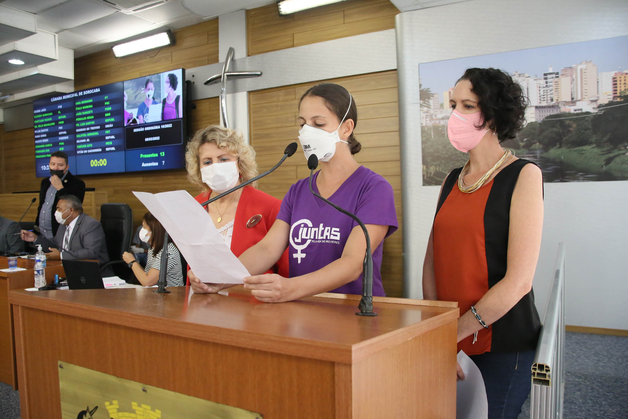 Para marcar a data, em homenagem as mulheres, o presidente da Casa, Claudio Sorocaba do PL, solicitou que as vereadores Iara Bernardi do PT e Fernanda Garcia do PSOL, ocupassem a posição de presidente e vice da Mesa Diretora para iniciar os trabalhos do Legislativo.