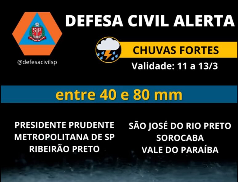 A Defesa Civil Estadual emitiu um alerta para a ocorrência de chuva forte e contínuas para Sorocaba e região, entre esta sexta-feira (11) até domingo (13).