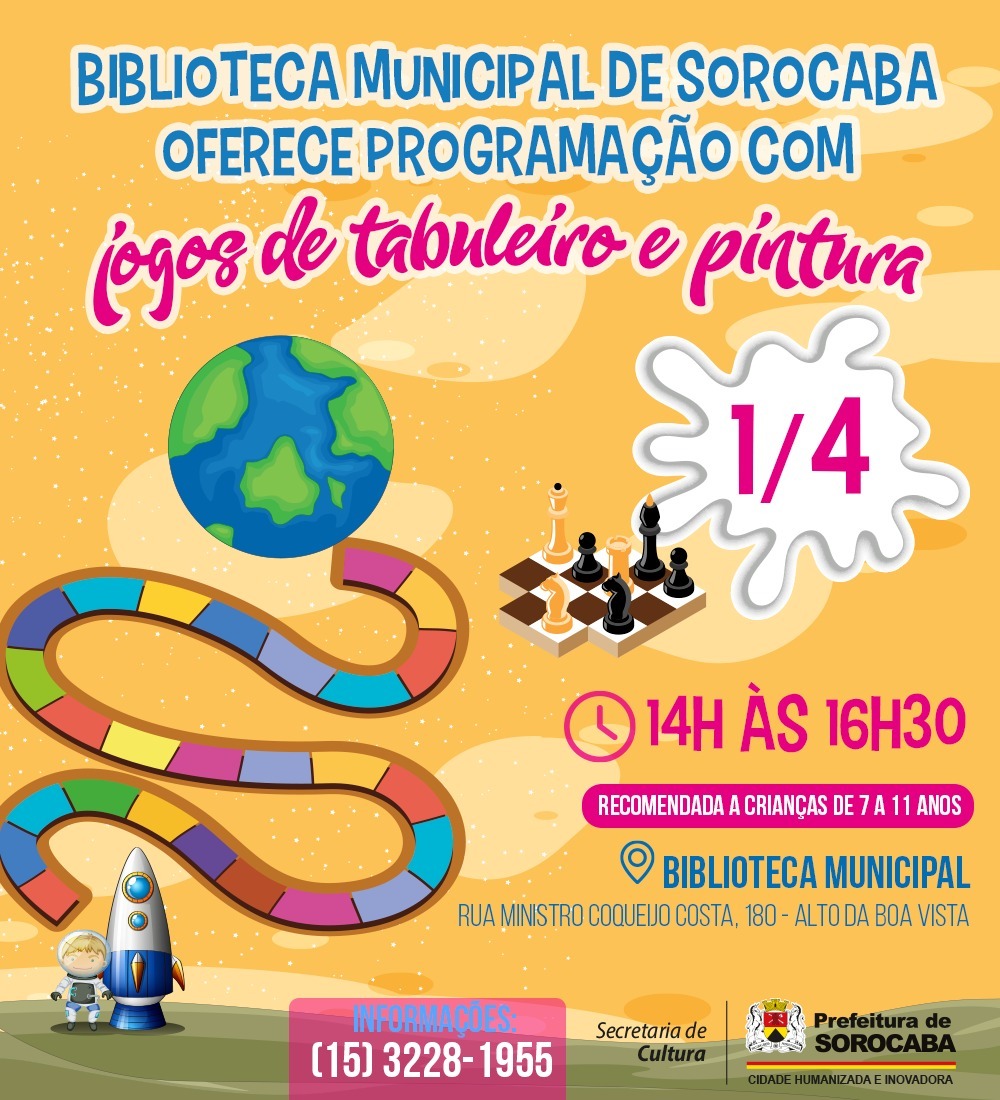 No PROGRAME-SE de hoje tem jogos de tabuleiro e atividades de pintura na Biblioteca Municipal de Sorocaba, a edição 2022 da Araçoiaba Fest e a Pizza do Bem da APAE SOROCABA neste sábado.