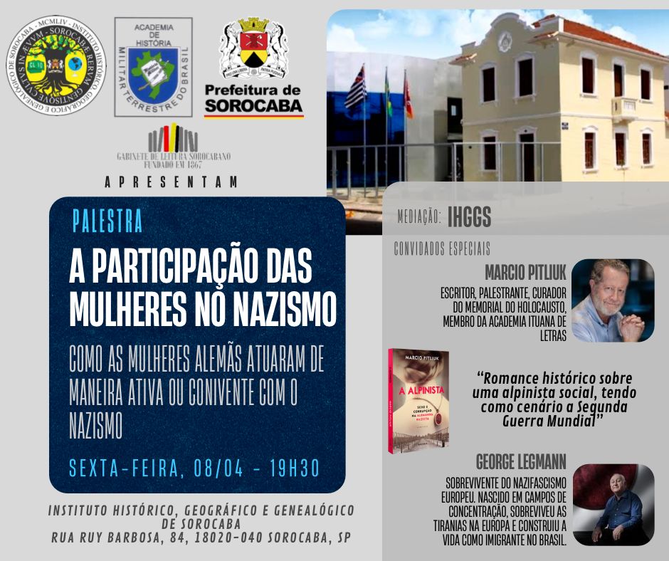 Está marcado para esta sexta-feira, às 19h30, um evento com o tema “A Participação das Mulheres no Nazismo”. Nele, será debatido todos os fatos históricos que aconteceram nesta época. O evento contará com a presença de George Legmann, sobrevivente do nazismo, e de Mauricio Pitluik, curador do Memorial do Holocausto.