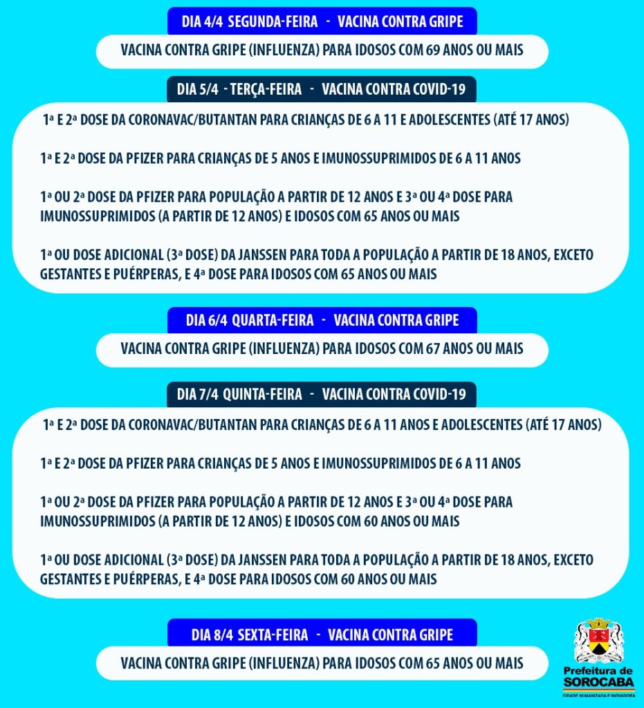O calendário semanal de vacinação contra Covid-19 para crianças (a partir dos 5 anos), adolescentes e adultos segue nesta quinta-feira (7) nas 32 Unidades Básicas de Saúde (UBSs) de Sorocaba.