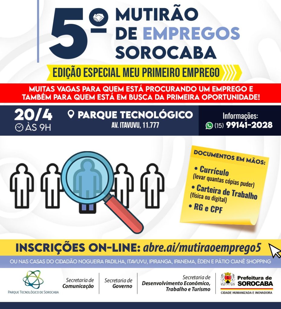 A Prefeitura de Sorocaba, por meio da Secretaria de Desenvolvimento Econômico, Trabalho e Turismo (Sedettur), com o apoio da Secretaria de Governo (Segov), Secretaria de Comunicação (Secom) e do Parque Tecnológico de Sorocaba (PTS), realizará, no dia 20 de abril, às 9h, no PTS, a 5ª edição do Mutirão de Empregos Sorocaba e, desta vez, especial do “Meu Primeiro Emprego”, com muitas vagas para quem está procurando um trabalho e também para quem está em busca da primeira oportunidade.