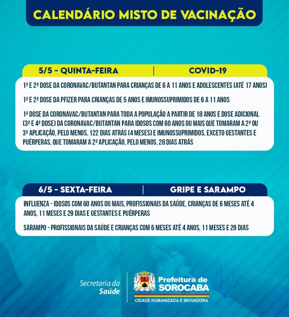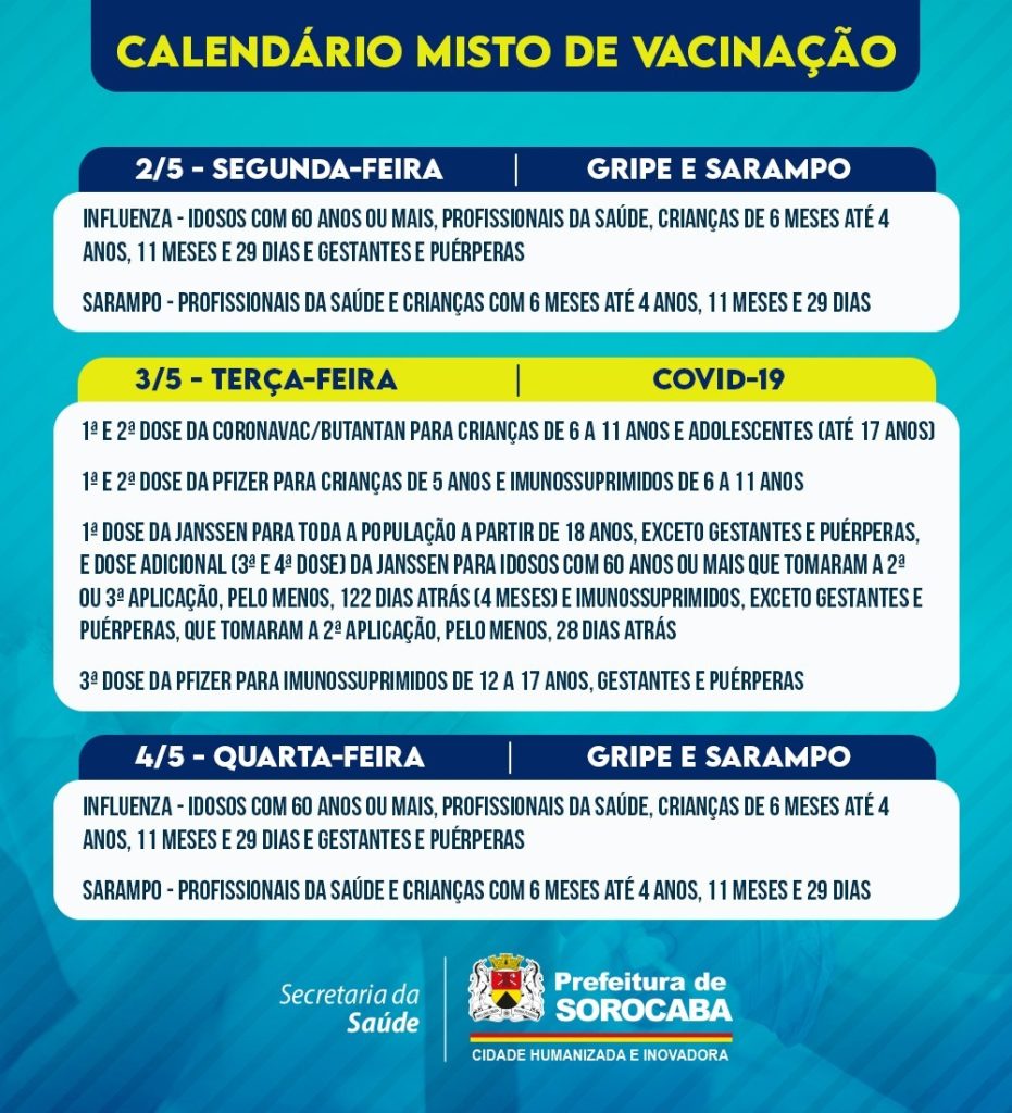 A Prefeitura de Sorocaba, por meio da Secretaria da Saúde (SES), divulgou o calendário misto de vacinação da próxima semana (do dia 2 ao dia 6/05), que imunizará contra Covid-19, gripe (Influenza) e sarampo, nas 33 UBSs (Unidades Básicas de Saúde) da cidade, das 9h às 15h.